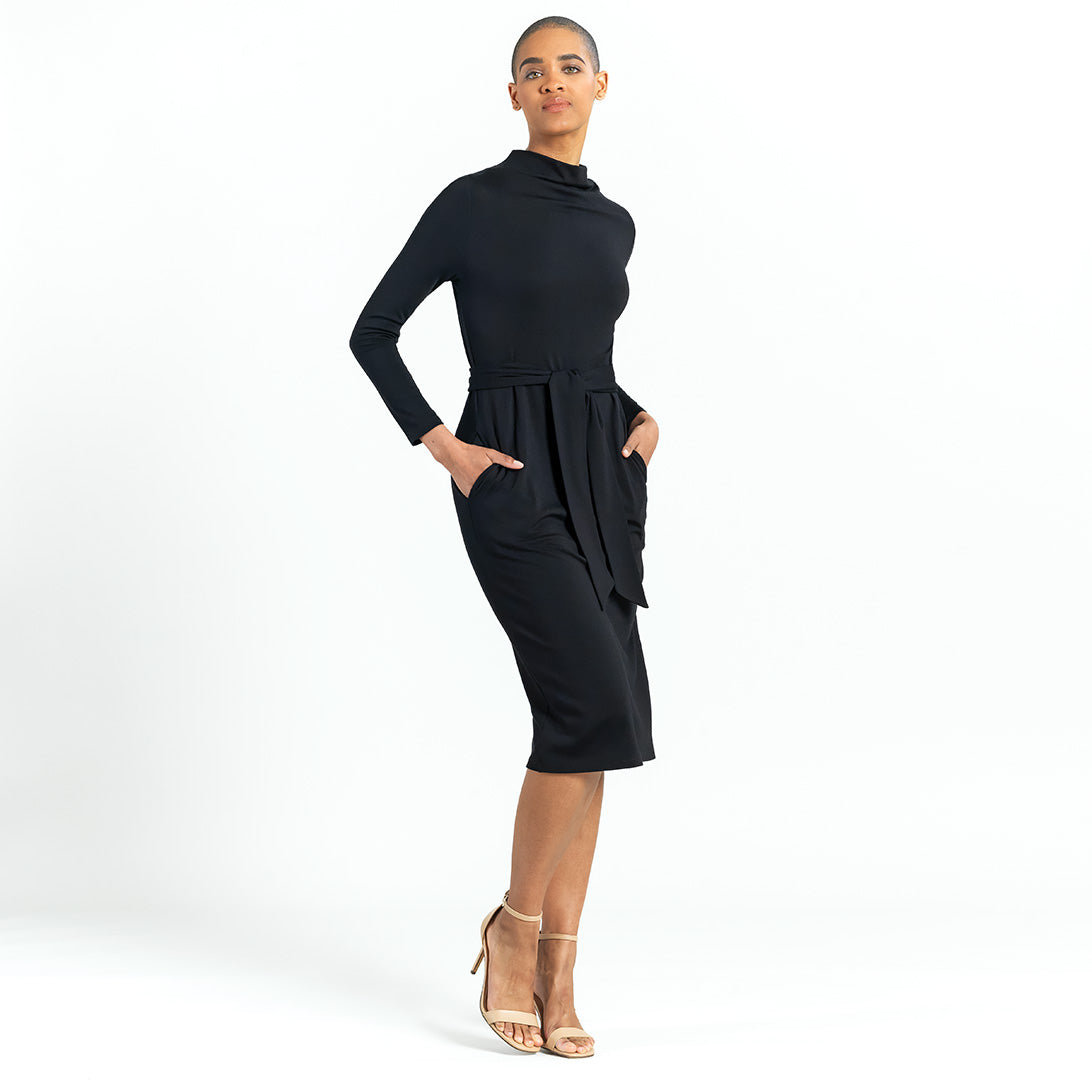 If you're looking for that timeless dress that will last for years to come, then look no further than our Lightweight Ponte Tie Waist Pocket Midi Dress! This figure-flattering dress features a soft-draped funnel neckline, long sleeves, belt-loop tie waist, side pockets, a sheath midi hemline with a vertical back seam, and a 10" back slit.