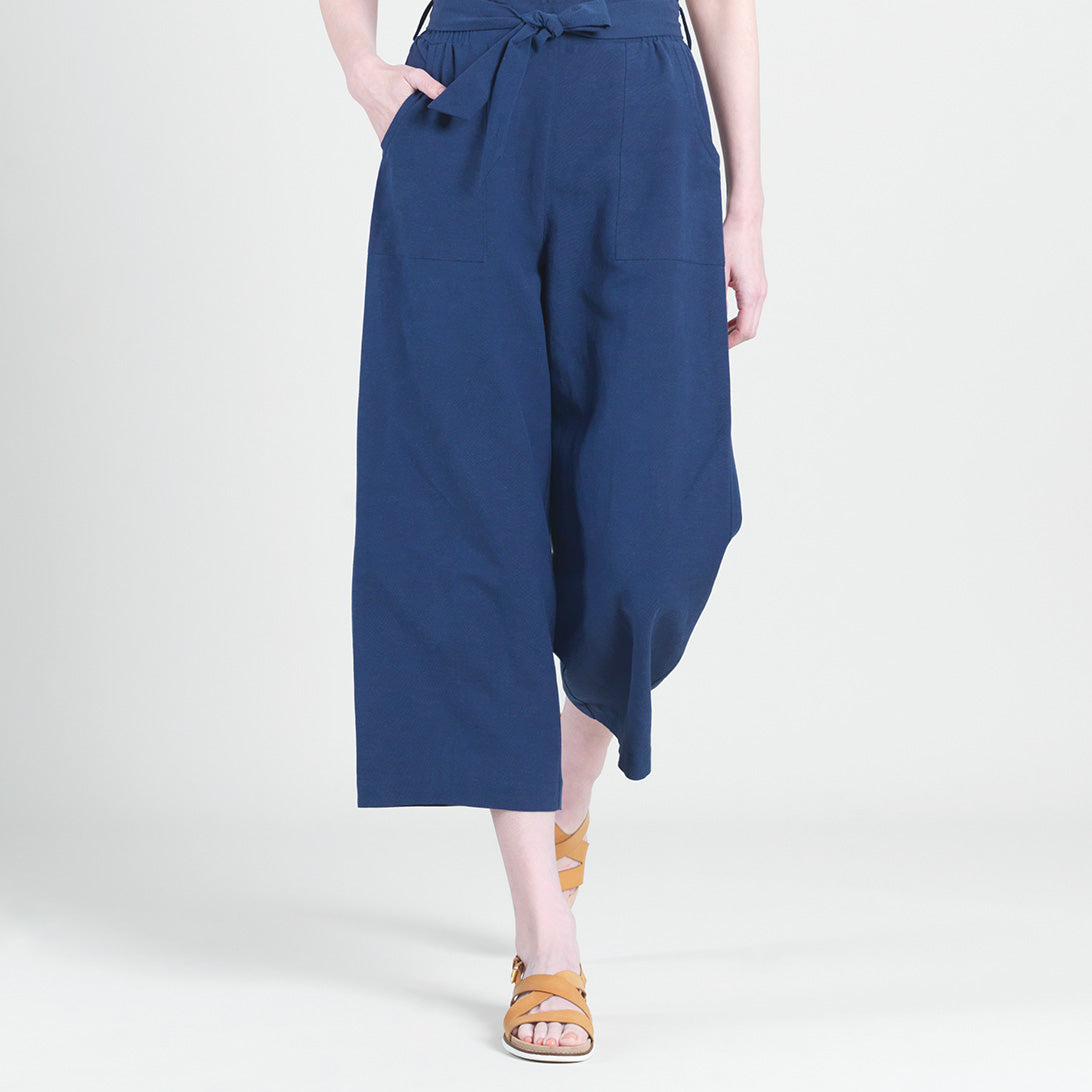 Our Linen Knit Tie Waist Cropped Pant is the epitome of casual innovation! This style features side pockets, a detachable belt tie, a 1.75" pull-on elastic waistband that has a shirred-back top-stitched finish that creates a gathered effect, a faux back-right pocket, and a relaxed-wide cropped hemline.
