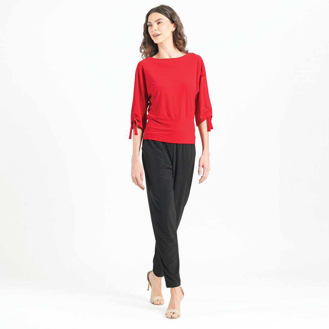 Get ready to pull out all the fashion stops in our Pull-Tie Cuff Blouson Top! Featuring a round neckline, dolman half-sleeves with pull-tie cuffs, designed to allow you to adjust the sleeve for a custom ruched effect, and waist hugging hemline, that displays an elegant blouson silhouette.