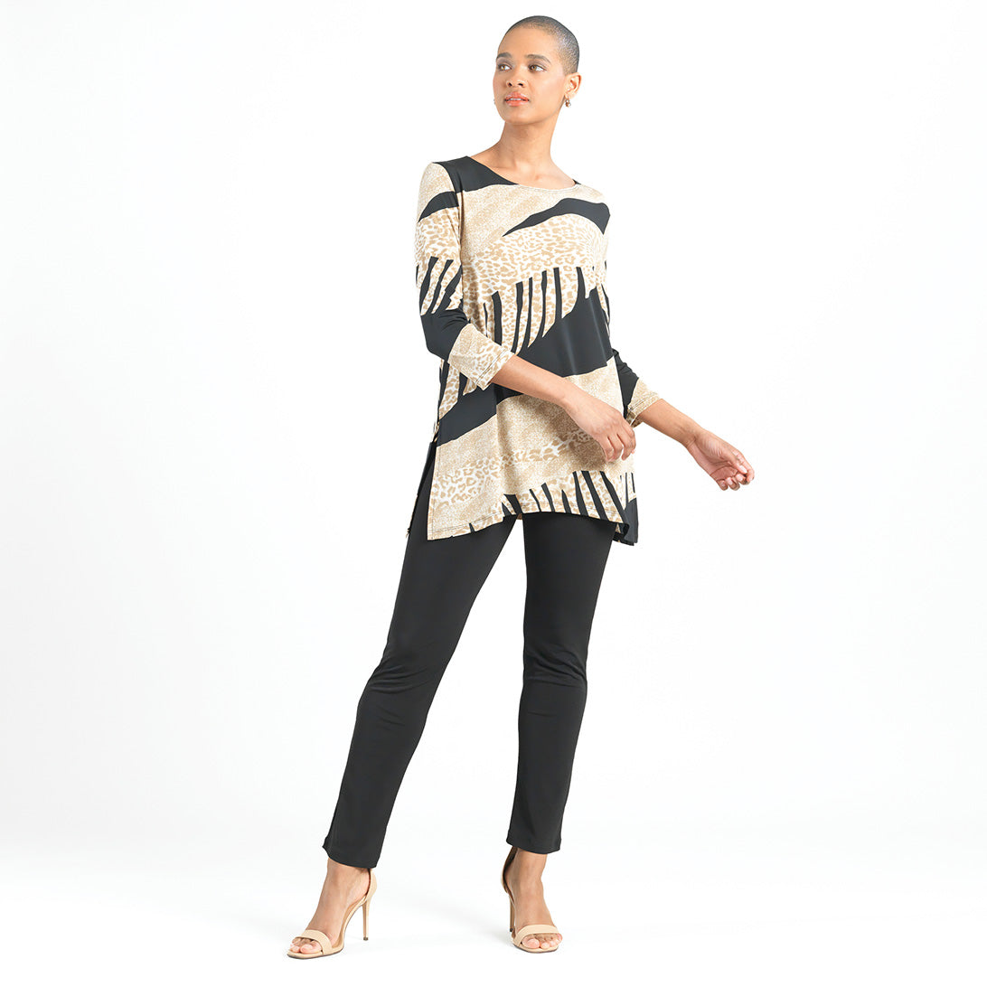 Embark on a style expedition like no other with our Safari Patch Side Vent Kerchief Hem Tunic! This tunic features a round neckline, 3/4 length sleeves, and a kerchief hemline with dual side vents that create a flattering silhouette.